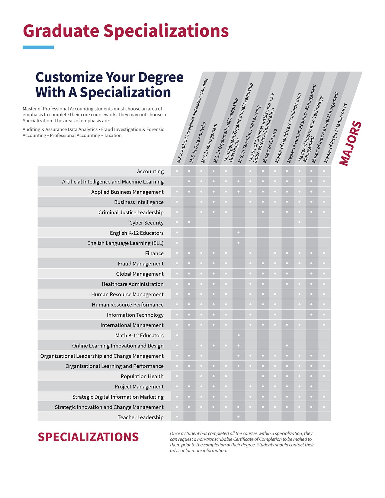 CSU Global does not offer double majors for graduate degrees. Additional majors or specializations will not be awarded or posted to a transcript once the master’s degree has been granted. However, prior to graduation, students may select a second specialization, provided that there is no course overlap; the second specialization will be listed on the transcript if all coursework is completed prior to degree conferral.